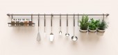 Przybory kuchenne, sypkie i przyprawy na żywo w doniczkach powiesić na ścianie. renderowania 3D