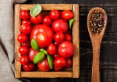 Ekologiczne pomidory z bazylią w vintage drewniane pudełko na podłoże drewniane kuchnia.