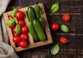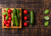 Zdjęcie "Ekologiczne pomidory z bazylią w vintage drewniane pudełko na podłoże drewniane kuchnia." może być wykorzystywane do celów osobistych i komercyjnych zgodnie z warunkami zakupionej licencji Royalty-free. Obraz jest dostępny do pobrania w jakości wysokiej rozdzielczości do 5760x3840.