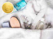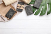 Naturalne, ręcznie robione mydło na na biały ręcznik. Widok z góry, szczegół. Pojęcie piękna i ciała opieki