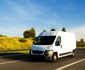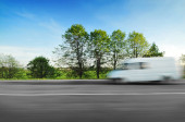 Biały samochód ciężarowy na drodze wsi z jesiennym lasem przed błękitnym niebem z chmurami