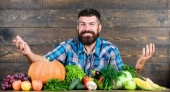 Zdrowia i diety. Fartuch kapelusz kucharz mężczyzna trzymać, sałata i brokuły. Koncepcja przepis wegańskie. Sprzedam sklep spożywczy świeże warzywa. Wegańska restauracja. Hipster główny szef kuchni wegańskiej café. Wybrać styl życia wegańskie