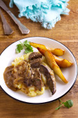 Wątroba wołowa z gruszki i puree ziemniaczanym. Widok z wyżej, top studio strzał