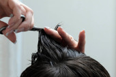 Świetna grzebień. Widok z tyłu głowy kobiety. Procedura Czesanie włosów microcurrents. Procedura medyczna skóry.