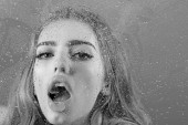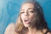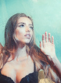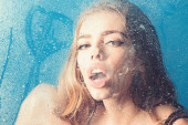 Zdjęcie "Moda uroda i miłości. Okno z wody spadnie przed dziewczyna z makijażem. Prysznic i higiena leczenie Uzdrowiskowe. Krople deszczu na oknie szkło w kształcie serca. Sexy kobieta za plastik z wody spada" może być wykorzystywane do celów osobistych i komercyjnych zgodnie z warunkami zakupionej licencji Royalty-free. Obraz jest dostępny do pobrania w jakości wysokiej rozdzielczości do 5760x3840.