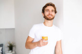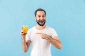 Obrazu przystojny, młody, brodaty mężczyzna w domu picie soku Wyświetlono kciuk w.
