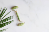 Widok z góry marmurowe okrągła deska z kosmetycznych krem, szczoteczka i pasta do zębów w Sex, laski ucha, bambus macierzystych i ręcznik na białym tle