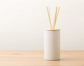uchwyt na szczoteczki do zębów, krem kosmetyczny i Bambus macierzystych w wazonie na stół i niebieskie tło