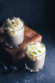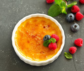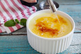pomarańczowy creme brulee w misce na podłoże drewniane, Selektywny fokus