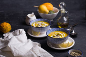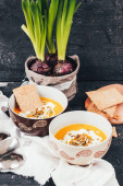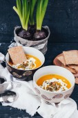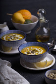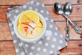 pomarańczowy creme brulee w misce na podłoże drewniane, Selektywny fokus