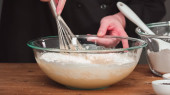 Krok po kroku. Mieszanie składników organicznych w szklanej misce upiec Chały.