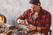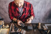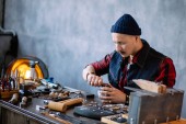 Artisan wprowadzenie rękawiczki na biurku, po dokonaniu naprawy biżuterii