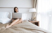 Leniwy poranek z jej laptopa, Młoda piękna kobieta siedzi na łóżku