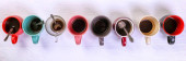 Pusty, brudne filiżanek o różnych kolorach na stole. Pojęcie dope kofeiny, brak energii i długo czekać. Miejsce.