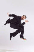 Biznesmen szczęśliwy taniec na białym tle na studio szary tło
