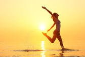 Sylwetka dziewczynki, skoki. Lato na plaży o zachodzie słońca.