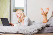 Zdjęcie "piękna kobieta z laptopa leżąc na łóżku." może być wykorzystywane do celów osobistych i komercyjnych zgodnie z warunkami zakupionej licencji Royalty-free. Obraz jest dostępny do pobrania w jakości wysokiej rozdzielczości do 5760x3840.