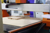 Układanie płyt wiórowych dla przetwarzania i produkcji mebli w przedsiębiorstwie do drewna. Linii produkcyjnej w fabryce mebli. Frezowanie i cięcie maszyny do obróbki drewna.