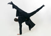 Biznesmen szczęśliwy taniec na białym tle na studio szary tło