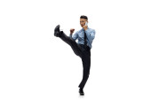 Zdjęcie "Biznesmen szczęśliwy taniec na białym tle na studio szary tło" może być wykorzystywane do celów osobistych i komercyjnych zgodnie z warunkami zakupionej licencji Royalty-free. Obraz jest dostępny do pobrania w jakości wysokiej rozdzielczości do 5760x3840.