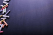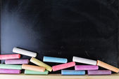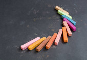 Kolorowe kredki leżą na czarny chalk zarządu, miejsce. Koncepcja szkoły, edukacji i dzieciństwo.