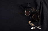 Na filiżankę kawy, anyż, cynamon, suszone ziarna kawy i pomarańczy na blacie ciemny. Pachnące przyprawy do picia, zbliżenie, widok z góry, płaskie ley.