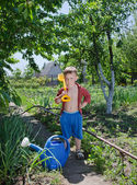 8 letni chłopiec w szorty i Czerwonym Kapturku podlewa ogród letni zielony