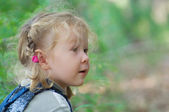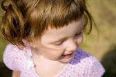 five-year-old girl w niebieskie groszki sukienka z płynącej włosów siedzi z głową w