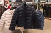 Zestaw ubrań, herb rack odzież sklep wewnątrz na tle. Kurtki zimowe w sklepie.