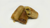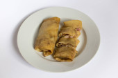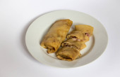 Dwa naleśniki smażone z szynką i serem na biały talerz, biały, szary tło