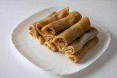 Dwa naleśniki smażone z szynką i serem na biały talerz, biały, szary tło
