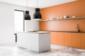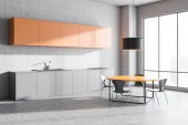 Zdjęcie "Rogu nowoczesna kuchnia z pomarańczowy i szary ściany, Posadzka betonowa, panoramiczne okna, pomarańczowy szafki, blaty szare i szary pasek z stolce. renderowania 3D" może być wykorzystywane do celów osobistych i komercyjnych zgodnie z warunkami zakupionej licencji Royalty-free. Obraz jest dostępny do pobrania w jakości wysokiej rozdzielczości do 5760x3840.