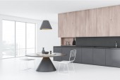 Rogu nowoczesna kuchnia z pomarańczowy i szary ściany, Posadzka betonowa, panoramiczne okna, pomarańczowy szafki, blaty szare i szary pasek z stolce. renderowania 3D