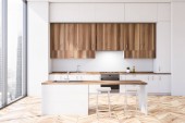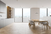 Rogu nowoczesna kuchnia z białe ściany, drewniana podłoga, duże okna, białe blaty, drewniane szafy i szary okrągłego stołu z krzesłami metalu. renderowania 3D