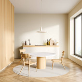 Zdjęcie "Wnętrze nowoczesna kuchnia z białe ściany, podłogi w kolorze szarym, duże okno, białe blaty, szafki drewniane i szary okrągłego stołu z krzesłami metalu. renderowania 3D" może być wykorzystywane do celów osobistych i komercyjnych zgodnie z warunkami zakupionej licencji Royalty-free. Obraz jest dostępny do pobrania w jakości wysokiej rozdzielczości do 5760x3840.