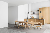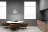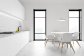 Wnętrze nowoczesna kuchnia z białe ściany, podłogi w kolorze szarym, duże okno, białe blaty, szafki drewniane i szary okrągłego stołu z krzesłami metalu. renderowania 3D