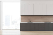 Zbliżenie na białych kuchni, blaty z zbudowany w zlew i kuchenka i drewniana szafka z otwartych drzwi i dania wewnątrz niego. renderowania 3D