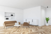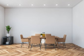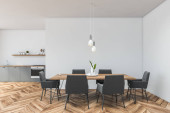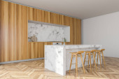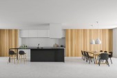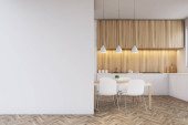 Rogu nowoczesna kuchnia z białe ściany, drewniane podłogi, blaty drewniane, marmurowe bar Stołki i drewniany stół z krzesłami biały. renderowania 3D