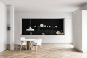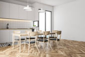 Zdjęcie "Rogu kuchni stylowe białe ściany, drewniane podłogi, białe blaty i szafki, biały pasek z wbudowanym zlew i drewniany stół z krzesłami żółty. renderowania 3D" może być wykorzystywane do celów osobistych i komercyjnych zgodnie z warunkami zakupionej licencji Royalty-free. Obraz jest dostępny do pobrania w jakości wysokiej rozdzielczości do 5760x3840.