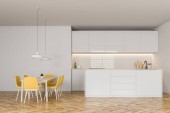 Rogu kuchni stylowe białe ściany, drewniane podłogi, białe blaty i szafki, biały pasek z wbudowanym zlew i drewniany stół z krzesłami żółty. renderowania 3D