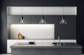 Wnętrze minimalistyczna kuchnia z szare ściany, Posadzka betonowa, szary blaty kuchenka, szafki białe i szare wyspa z wbudowanym zlew. renderowania 3D