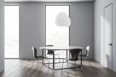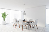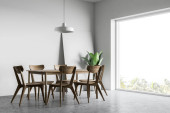 Rogu stylowej jadalni z szare ściany, kamienne podłogi, duże okno, drewniany stół z krzesłami szary i drewniane i dwie lampy sufitowe. renderowania 3D