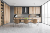 Zdjęcie "Rogu stylową kuchnią z szare ściany, Posadzka betonowa, szary blaty drewniane szafy i szary i drewniany bar stołki. renderowania 3D" może być wykorzystywane do celów osobistych i komercyjnych zgodnie z warunkami zakupionej licencji Royalty-free. Obraz jest dostępny do pobrania w jakości wysokiej rozdzielczości do 5760x3840.