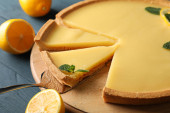 Sernik cytrynowy na czarnym tle ozdobione lemon zest zbliżenie