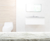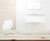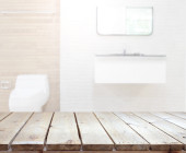 Wnętrze minimalistyczna łazienka z biały i drewniane ściany, drewniane podłogi i białe wanny z szare ręczniki wiszące na nim. renderowania 3D