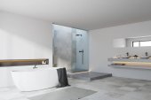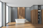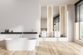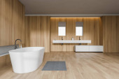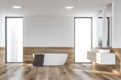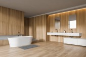 Zdjęcie "Rogu nowoczesna łazienka z biały i drewniane ściany, drewniane podłogi, białą wanną i podwójna umywalka stojąca na drewniany blat z pionowe lustra. renderowania 3D" może być wykorzystywane do celów osobistych i komercyjnych zgodnie z warunkami zakupionej licencji Royalty-free. Obraz jest dostępny do pobrania w jakości wysokiej rozdzielczości do 5760x3840.