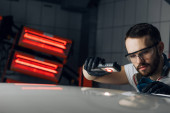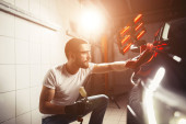 młody człowiek przyjemny sprawdzanie uszkodzony samochód
