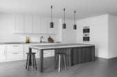Rogu kuchni stylowe białe ściany, drewniane podłogi, niebieski blaty z wybudowania zlew i kuchenka, drewniane szafki, niebieski Szafka z piekarników i niebieski i drewniany bar stołki. renderowania 3D