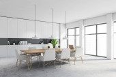 Wnętrze biura, sale imprezowe, z białymi ścianami, Posadzka betonowa, szklane drzwi, panoramiczne okna, szklany stół z krzesłami żółty i biały regały. renderowania 3D