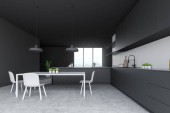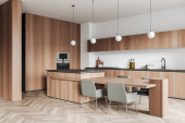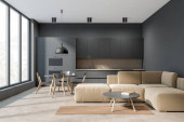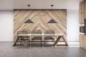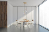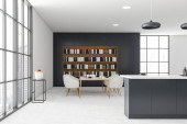 Zdjęcie "Wnętrze biura, sale imprezowe, szare ściany, drewniane podłogi, panoramiczne okna, drewniany stół z krzesłami biały i szary regały. renderowania 3D" może być wykorzystywane do celów osobistych i komercyjnych zgodnie z warunkami zakupionej licencji Royalty-free. Obraz jest dostępny do pobrania w jakości wysokiej rozdzielczości do 5760x3840.